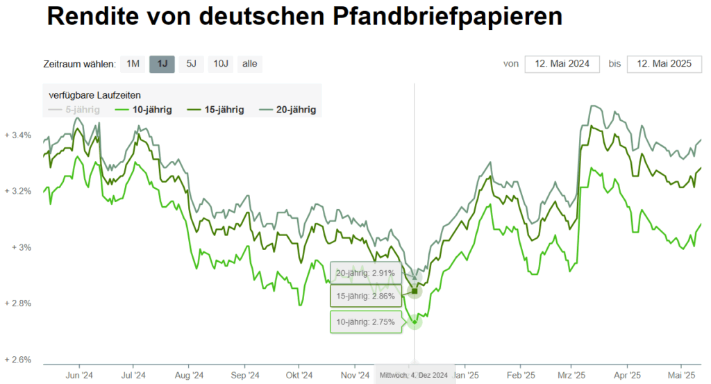 Lustigerweise ist unsere Befürchtung, dass das KfW-Darlehen zum Januar ausläuft, nicht eingetreten. Dafür haben es ab Januar die Vögel von den Dächern gezwitschert, dass die Bundesregierung wohl einen historischen Schuldenberg aufnehmen möchte, um die Franzosen, äh, Russen ein für alle Mal im Feld zu bezwingen. Entsprechend haben sich die Zinsen nach oben korrigiert. Schauen wir mal, wohin diese geistige Verirrung führen wird.