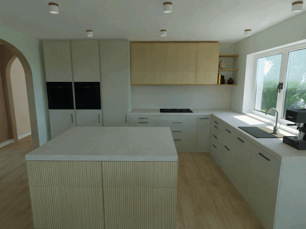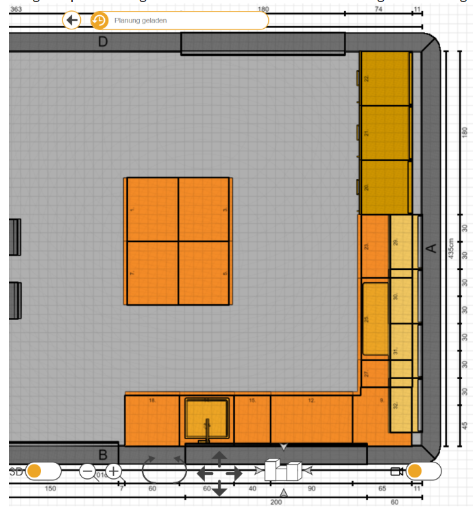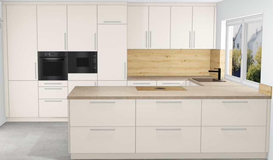 Ich hatte seitdem noch einmal Kontakt mit Evelinn vom Forum. Sie meinte, dass unser Rastermaß von 1-3-3, also einer schmalen und 2 großen Schubladen für die Unterschränke, möglicherweise nicht ideal ist und wir lieber darüber nachdenken sollten, 1-1-2-2 zu wählen, also schmal – schmal – mittel – mittel. Dem würden wir uns anschließen. Außerdem werden wir unsere Fronten jetzt wohl auch deckenhoch ziehen. Am Ende sieht die Küche dann wohl ungefähr so aus: