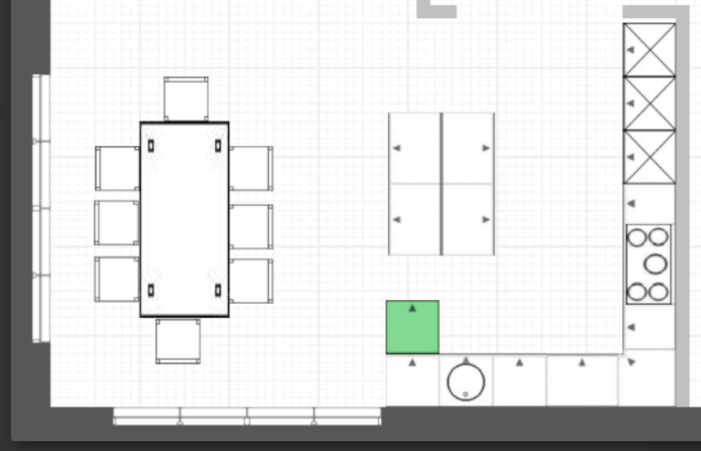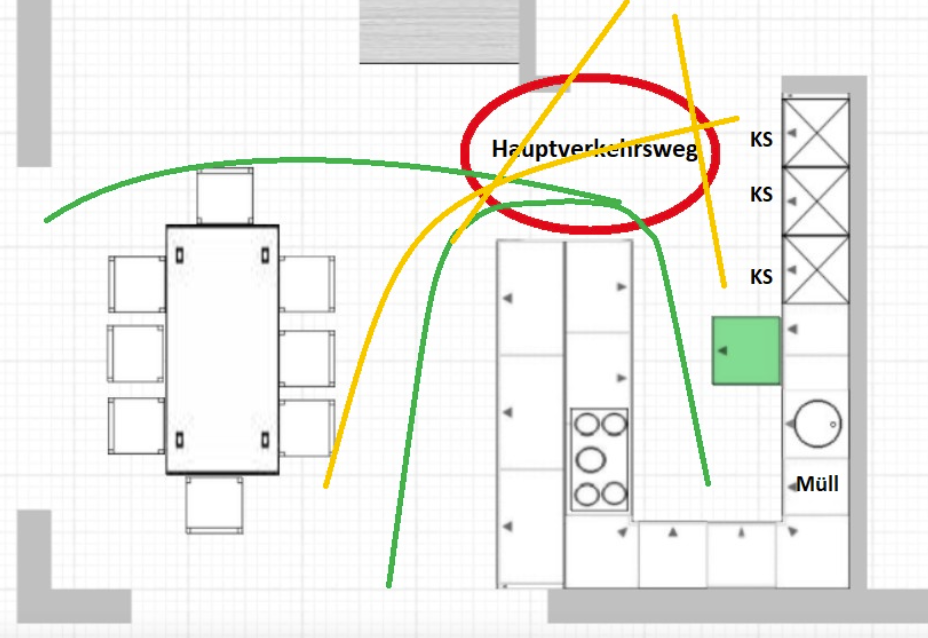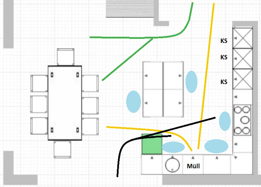 Mein erster Impuls war: Was soll der Mist? Wieso eine Kücheninsel, wenn ich auch ein U machen kann oder besser einen Zweizeiler mit einem reinen Arbeitsbereich? Die Argumentation von Evelinn brachte aber eine neue Dimension ins Spiel: Laufwege! Crazy hoch 2. Tatsächlich war es diese Skizze, die mich ins Grübeln brachte: