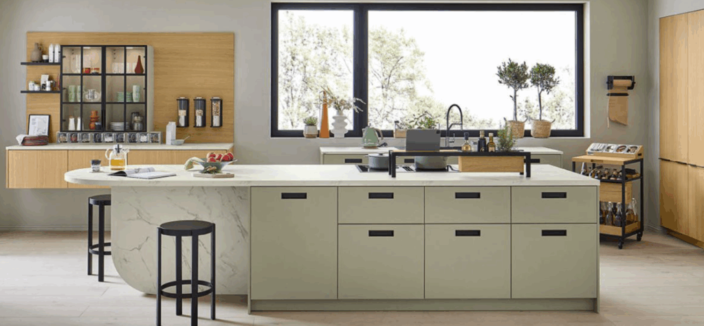 Wie gesagt: Wir hatten im Herbst ’24 keine wirkliche Idee, was genau unsere Küche können soll, und wollten uns für die Budgetkalkulation erstmal ein erstes Angebot einholen. Schwupps sind wir zum Küchenbauer meiner Schwiegereltern gefahren: Rempp. Die haben einen guten Ruf in der Branche und stehen im Verdacht, hochwertig abzuliefern. Das Angebot umfasst die Elektrik mit Mittelklasse-Siemens-Einbaugeräten, Bora-Kochfeld und Schichtstoff-Arbeitsplatte. So sah das Ganze dann aus:
