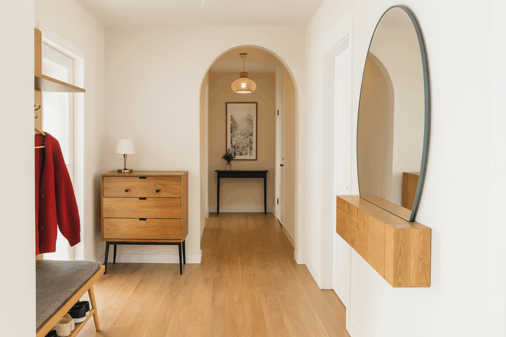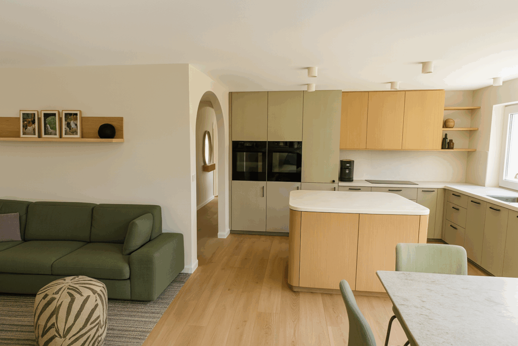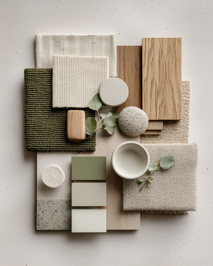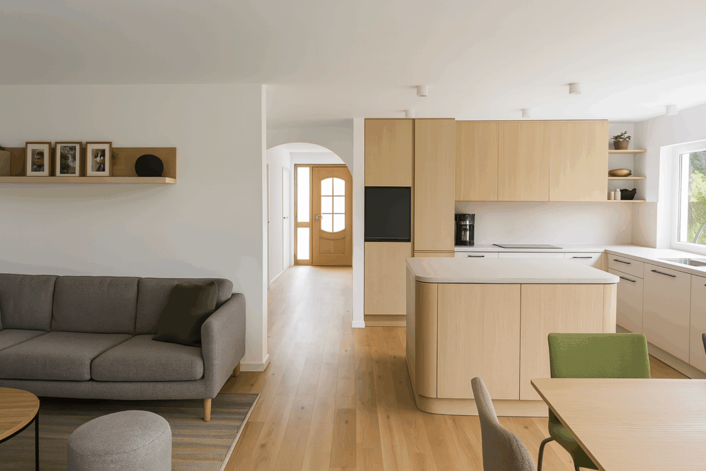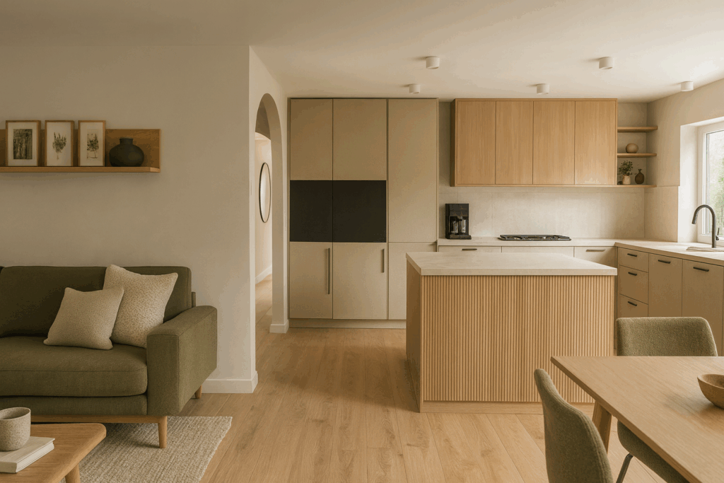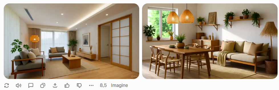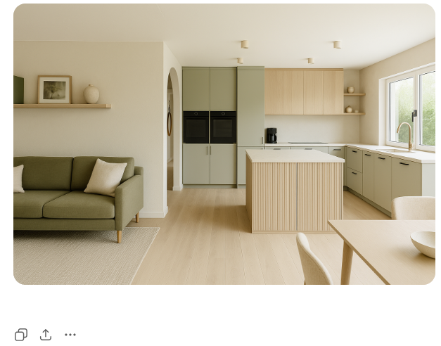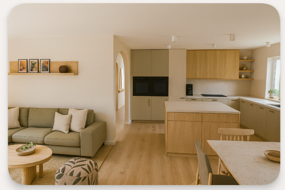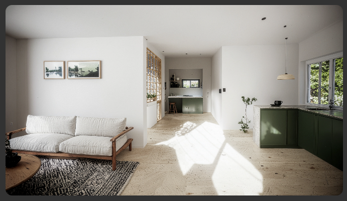 Erstelle ein möglichst realistisches Bild auf Basis des Renderbilds. Abstände, Perspektiven, Farben, Türen und Fenstergrößen bleiben exakt gleich. Ersetze Möbel und Deko mit realistischen Stücken im Japandi-Stil. Angehängt ist auch ein Moodboard. Verwende passende Farben und Materialien. Gib das Bild im 16:9 Format aus.