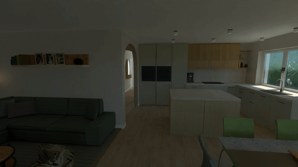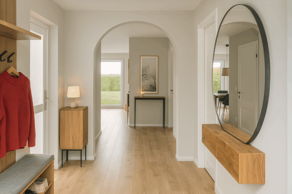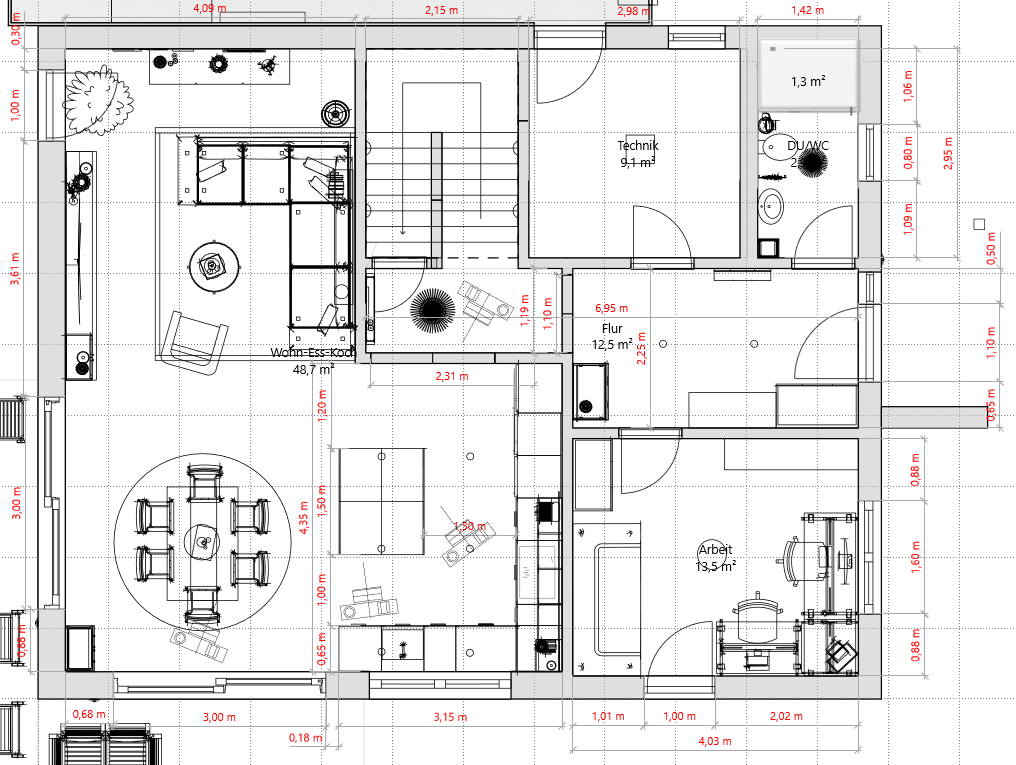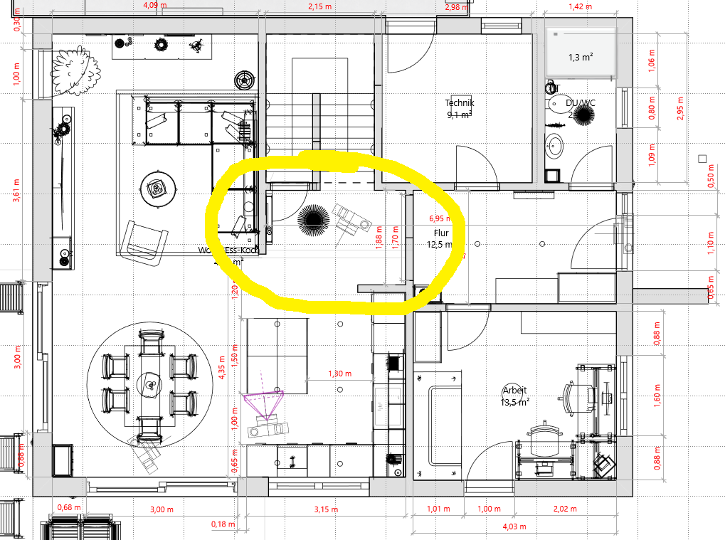 Beim Spielen mit der KI kam mir noch eine Idee für unseren Grundriss. Nicht, dass ich nicht glücklich wäre mit unserem Haus, so wie wir es geplant haben, aber in einigen Dingen hatte ich doch andere Ansichten als meine Frau. Ein Zankapfel war seit jeher die Trennung: Wohn-Ess-Kochbereich und Flur – oder offenes vs. halboffenes Wohnkonzept. In heroischer Anstrengung und unter Bezugnahme des Bauherrenforums konnte ich meine bessere Hälfte überreden, keine Tür vom Flur in den Allraum zu bauen. Mehr ging dann aber wirklich nicht. Tatsächlich bevorzuge ich auf den Plänen eigentlich immer das offene Wohnkonzept, musste aber feststellen, dass mir beim Nachbauen der Eindruck doch zu luftig war. Jedenfalls bin ich mit folgender Idee um die Ecke gekommen: